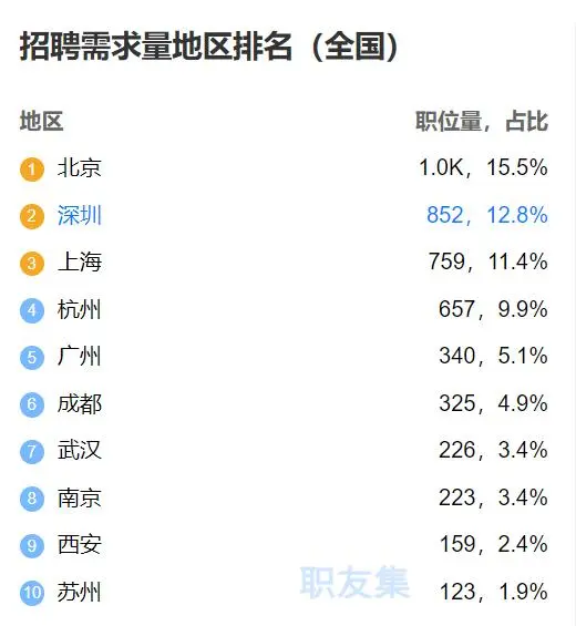 招聘最多的城市還是集中在一線城市,其中北京最高,占比達到15.5%