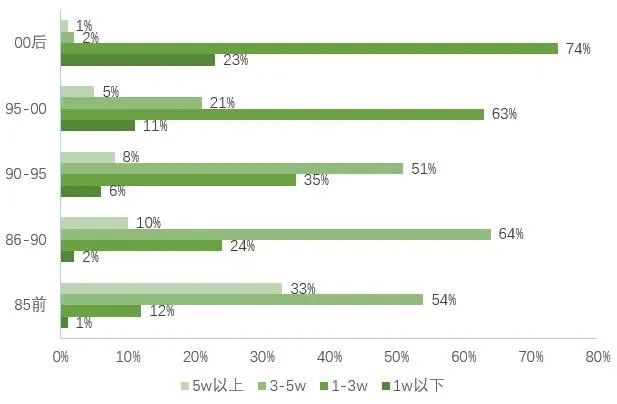隨著工齡的增加,相應的,程序員的薪資也會得到進一步的提高,95年-00年出生的程序員中,21%的程序員月薪沖到3-5萬元。而大多晉升到管理層的86-90程序員們,薪資不少已經達到了3-5萬元,33%的程序員月薪達到5萬元以上。