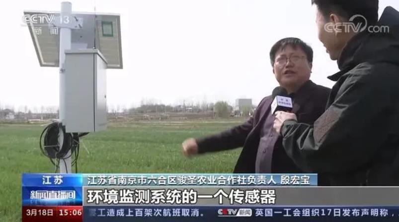 江蘇省南京市六合區駿圣農業合作社負責人 殷宏寶:這個氣象站都是順利獲得一定的傳感器數據來反映農田里面的情況。這個就是我們田間的一個獨立的傳感器,環境監測系統的一個傳感器。