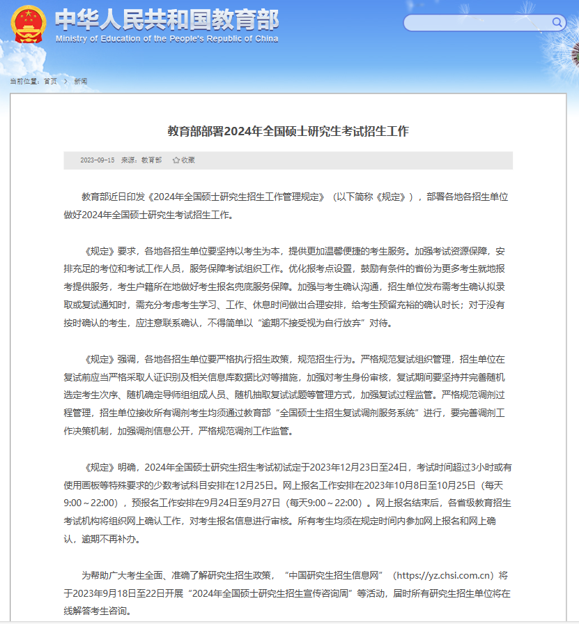 教育部近期印發(fā)《2024年全國碩士研究生招生工作管理規(guī)定》(以下簡稱《規(guī)定》),部署各地各招生單位實(shí)行2024年全國碩士研究生考試招生工作。
